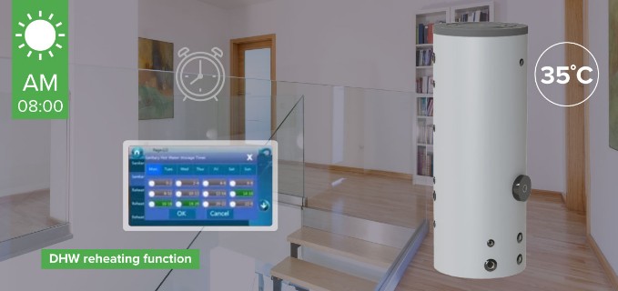 Der Warmwassermodus sollte in jedem Heizsystem (sofern vorhanden) oberste Priorität haben. BeeSmart bietet eine verbesserte zweistufige Logik zur Erzeugung von Sanitärwasser, die es den Benutzern ermöglicht, den Heizbedarf besser zu decken und gleichzeitig Warmwasser zu liefern. Benutzer können wählen, ob sie das System für Warmwasser mit hoher Temperatur betreiben möchten, wenn die Heizlast niedrig ist, und für Warmwasser mit mittlerer Temperatur, wenn die Heizlast hoch ist.
