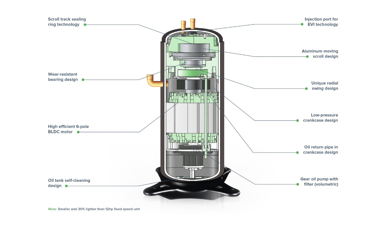 Der leistungsstarke Inverter-Kompressor unterstützt eine stufenlose Leistungsanpassung im Bereich von 15 % bis 100 %. Es funktioniert auch unter Teillast gut und vermeidet häufige Starts und Stopps. Der Einsatz der EVI-Technologie ermöglicht den Betrieb bei extremer Kälte oder Hitze.