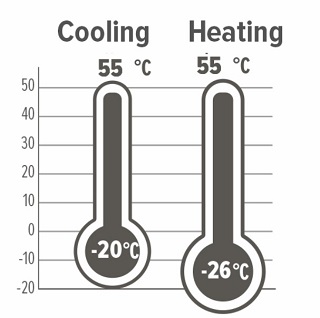 Zusammen mit Ventilatoren auf Basis von Invertertechnologien. Die Mikroprozessorsteuerung und andere Komponente einer Weltmarke garantieren unterbrechungsfreie Arbeit, sowohl bei niedrigen Temperaturen bis -26 als auch bei Hitze bis +55 Grad. Es kombiniert hohe Leistung mit präziser und ganzjähriger Aufrechterhaltung der Klimaleistung für jedes System.