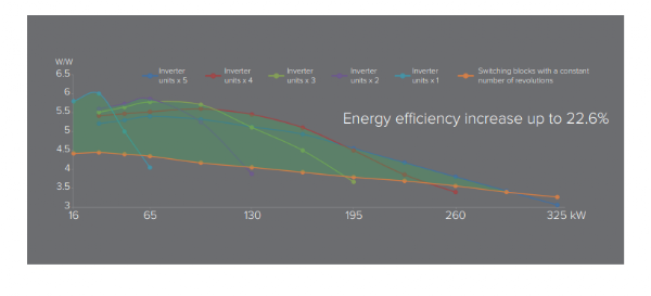 Im Betrieb hat Teillast Vorrang. Beim gemeinsamen Betrieb mehrerer Geräte wird jeder Kompressor durch ein intelligentes Management frequenzgesteuert, was für einen ausgewogenen Betrieb im energieeffizienten Bereich der Leistungskurve sorgt.