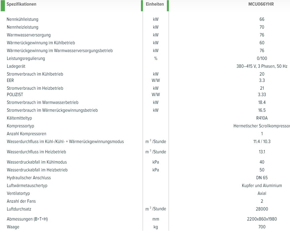 3. Kühl- und Wärmerückgewinnungsmodus: Leistungs- und Stromverbrauchsparameter beziehen sich auf den Nennwasserdurchfluss, die Auslasstemperatur +7 °C für Kühlung und +45 °C für Wärmerückgewinnung.